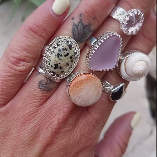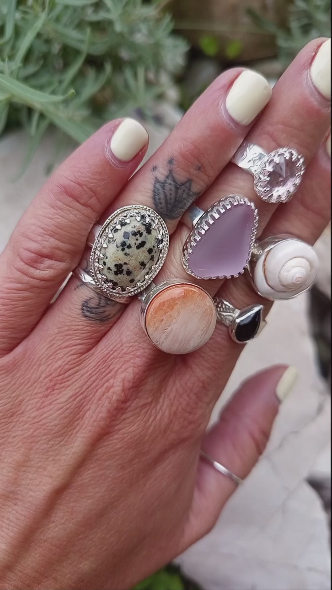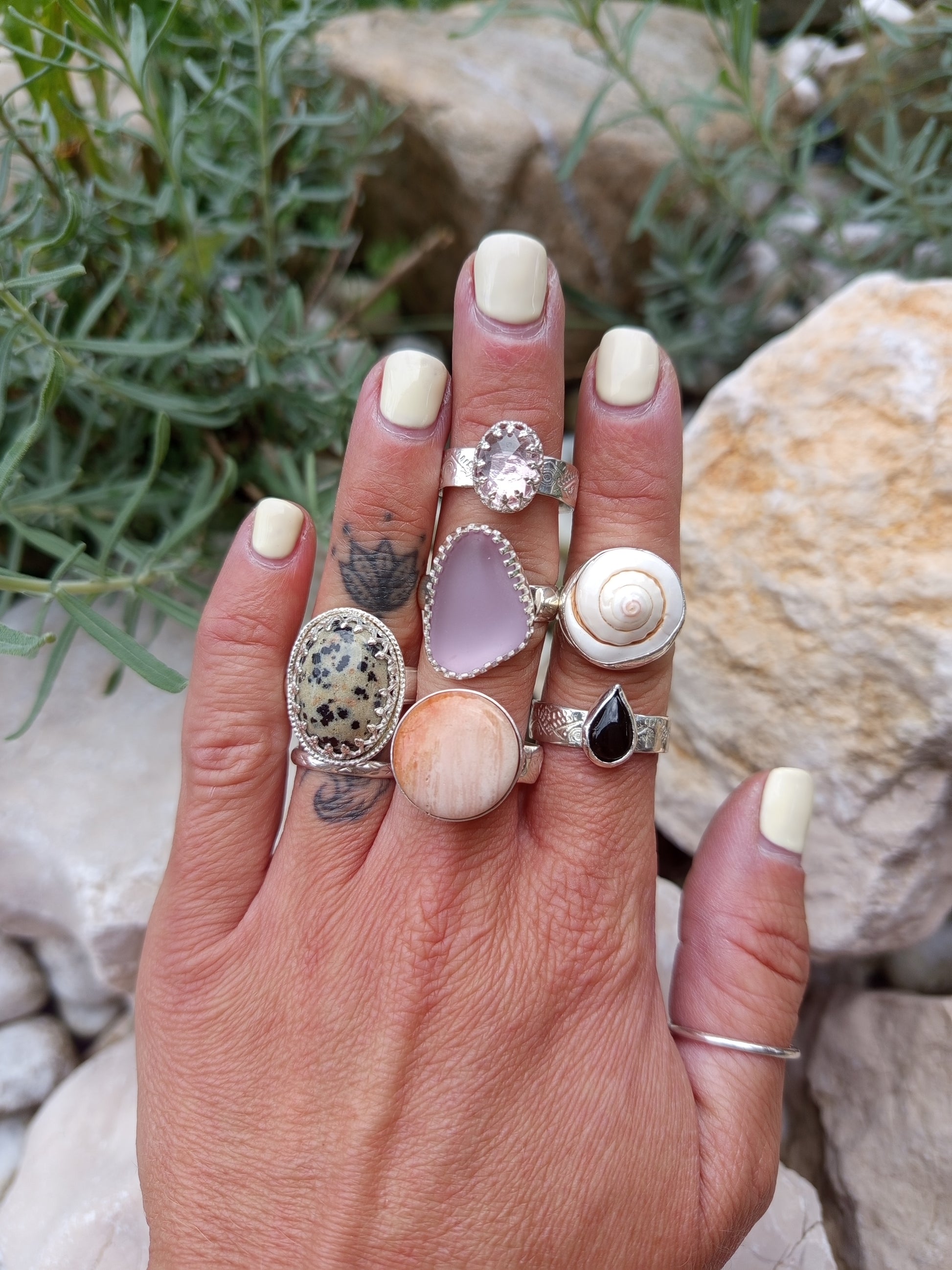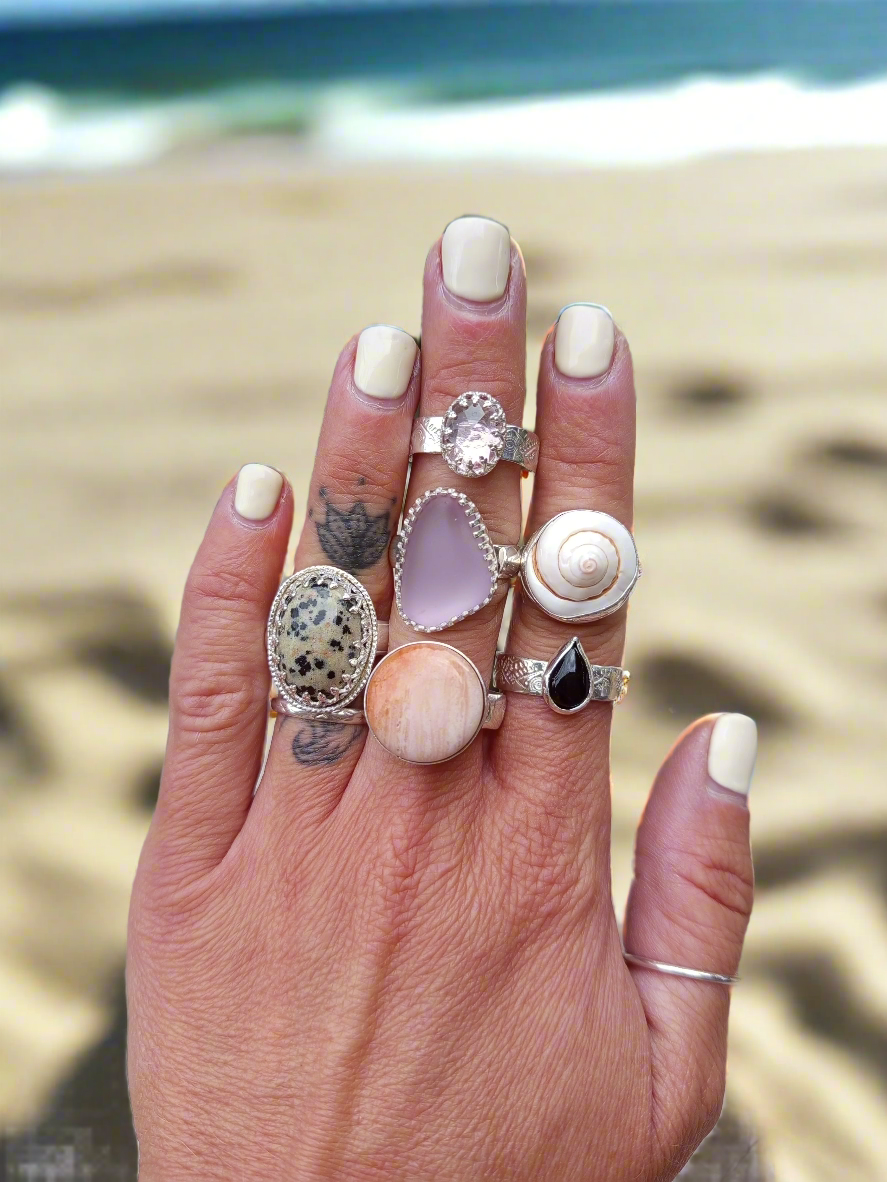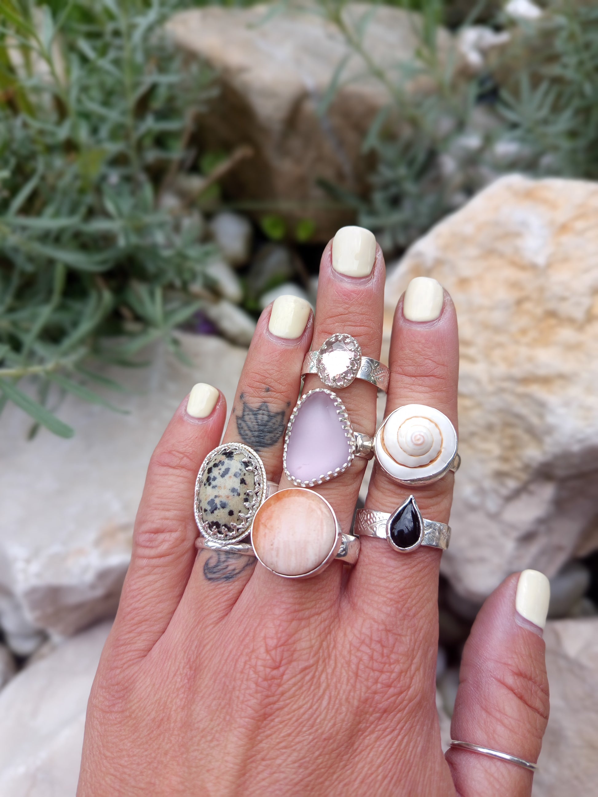 A soulful collection of handcrafted sterling silver rings inspired by the raw beauty of nature. From speckled dalmatian jasper and pastel rose quartz to shimmering spiral shells and deep black onyx – each ring is a unique treasure evoking memories of wild shores, sun-bleached stones, and the untamed sea. Designed to celebrate the earthy tones and ocean whispers that connect us back to what matters most.From left to right: