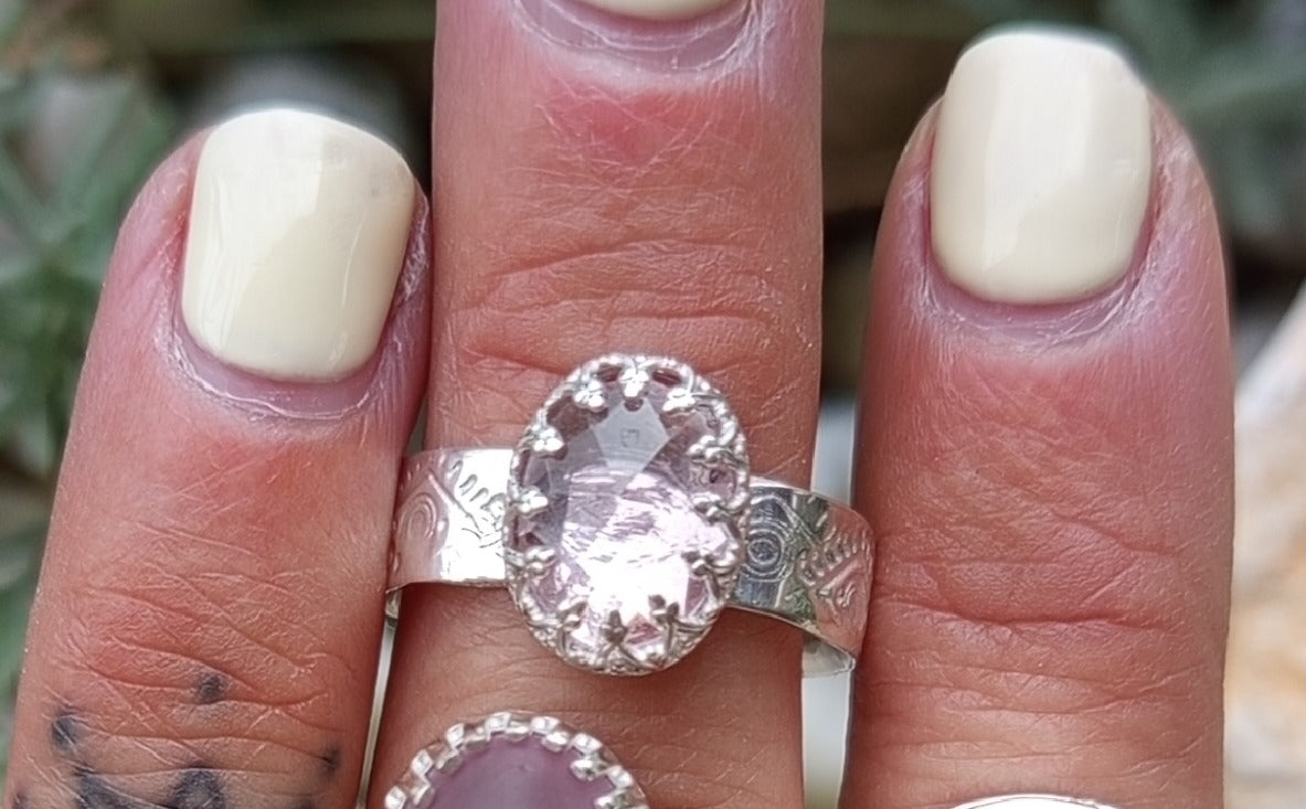 Soft pink Morganite gemstone sparkling with subtle light, set in an elegant silver band with hammered details. Known as a stone of divine love and compassion.