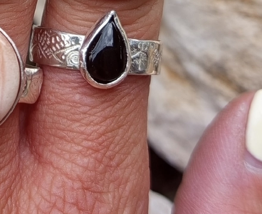 A bold pear-shaped Black Onyx stone in a textured silver band. Offers strength, focus, and a mysterious allure.