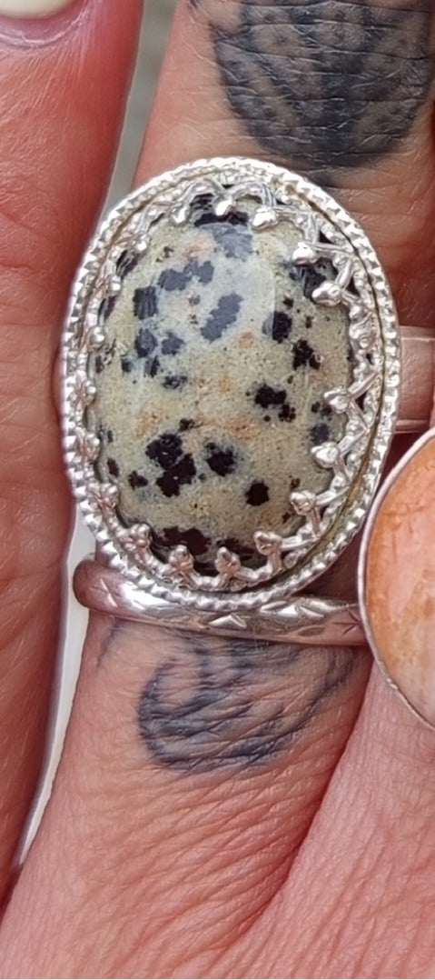 A playful statement ring featuring Dalmatian Jasper with its unique natural speckles, set in handcrafted sterling silver. Brings grounding energy and a touch of wild nature.